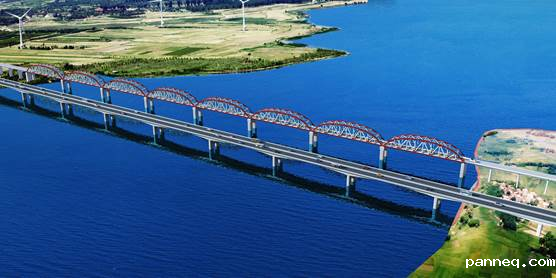 官厅水库特大桥位于张家口市怀来县,于东花园镇和狼山镇之间跨越官厅水库,桥梁全长9.08公里,其中主桥以8孔110米简支拱形钢桁梁跨越官厅水库,主桥基础采用15根直径2.5米桩基础,桩长90米左右,通过施工栈桥搭建施工平台,采用钢板桩围堰水上施工,主梁采用工厂预制杆件,再从两岸拼装成梁后顶推至湖中桥墩位置,官厅水库特大桥主桥是国际首例通行350公里时速有砟高速铁路的钢梁桥。