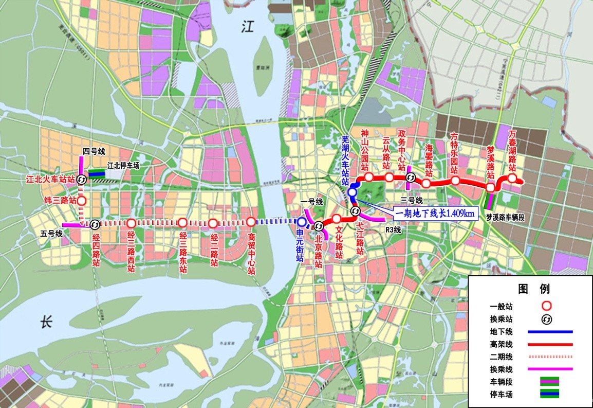 芜湖市轨道交通1号线工程起于保顺路站,终于白马山站,呈南北走向,线路全长约30.460km,共设车站25座,全部为高架车站,其中换乘站3座。芜湖市轨道交通2号线一期工程起于北京路站,终于万春湖路站,呈东西走向,线路全长约15.796km,共设11座车站(高架站10座、地下站1座),换乘站3座。共设置停车场1处、车辆段2处, 2019年12月底建成,2020年1月初开通试运营,2021年正式运营。