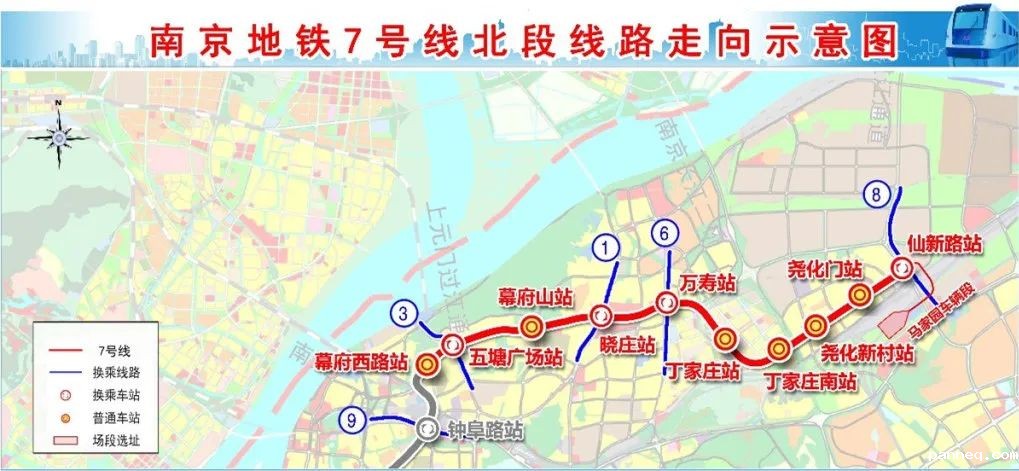 南京地铁7号线北段工程西起幕府西路站,沿幕府西路、幕府东路行进,沿线设置五塘广场站、幕府山站、晓庄站和万寿站,随后向南转入寅春路设丁家庄站,再向东转入尖山南路设丁家庄南站,随后沿尧佳路设尧化新村站、尧化门站,东至仙新路站。线路全长13.836千米,设车站10座,均为地下车站,设区间9个,设出入段线1个,设车辆段1座。