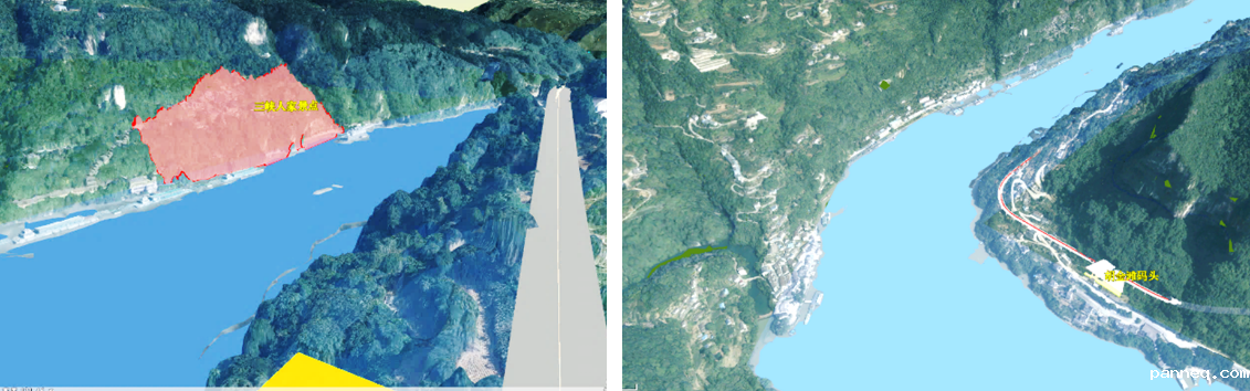 3、在三峡旅游轨道交通初测项目中,站场专业利用本系统基于倾斜摄影及BIM技术构建的铁路三维大场景,开展胡金滩码头站站位方案设计验证和方案优化工作。对远站位高架站方案和近站位高架站方案的观景效果进行对比分析,并结合工程地质、交通衔接及工程可实施性等因素,确定推荐采用远站位高架站方案。