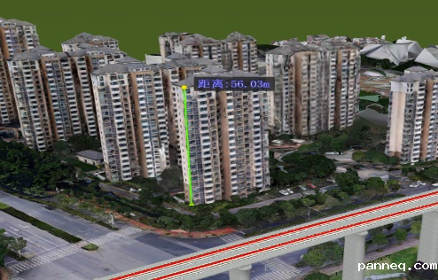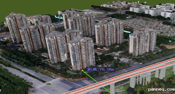 5、在如通苏湖铁路定测项目中,环保专业结合BIM与GIS构建的三维大场景中线路周边的居民点、学校、医院等噪声振动敏感点分布情况,开展三维虚拟踏勘,获取噪声敏感点构筑物高度、层数及平面距离等参数,以此开展噪声振动预测,指导后续减振降噪措施设计工作。