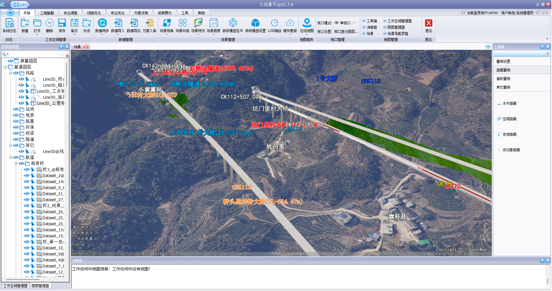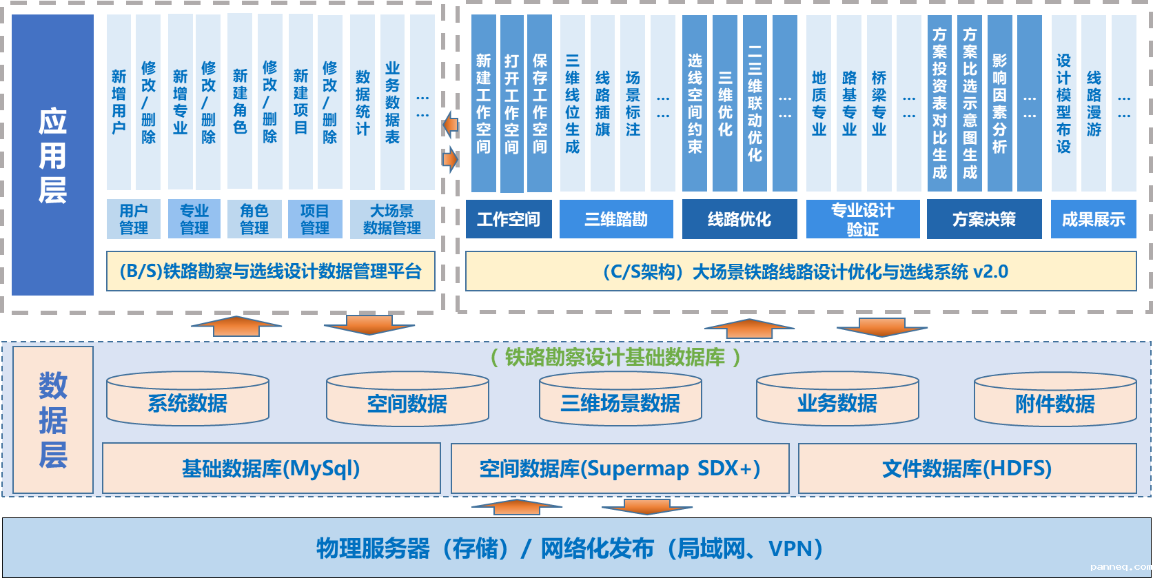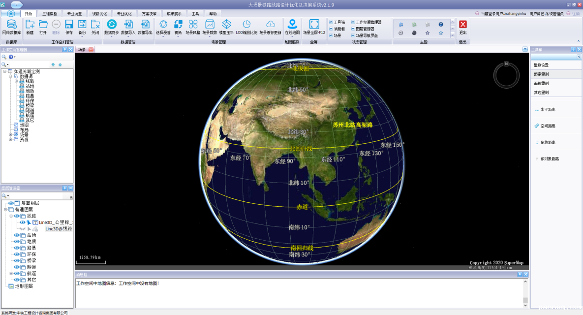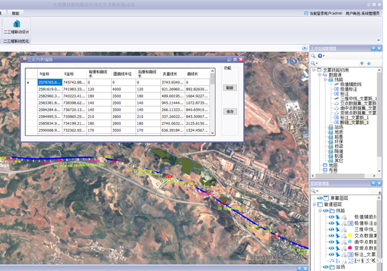 “大场景铁路线路设计优化及决策系统”是一款综合应用BIM技术与三维GIS技术,融合三维地理空间数据、设计数据与BIM模型等多源数据,服务于铁路工程勘察设计应用的三维信息化平台。系统采用C/S架构搭建,在数据层设计构建了“铁路勘察设计基础数据库”,实现了项目数据、设计数据及BIM模型数据的统一管理。在应用层研发了“大场景铁路线路设计优化及决策系统”,并开发了后台数据管理系统,实现了铁路三维大场景构建以及数字勘察、设计优化等应用功能。