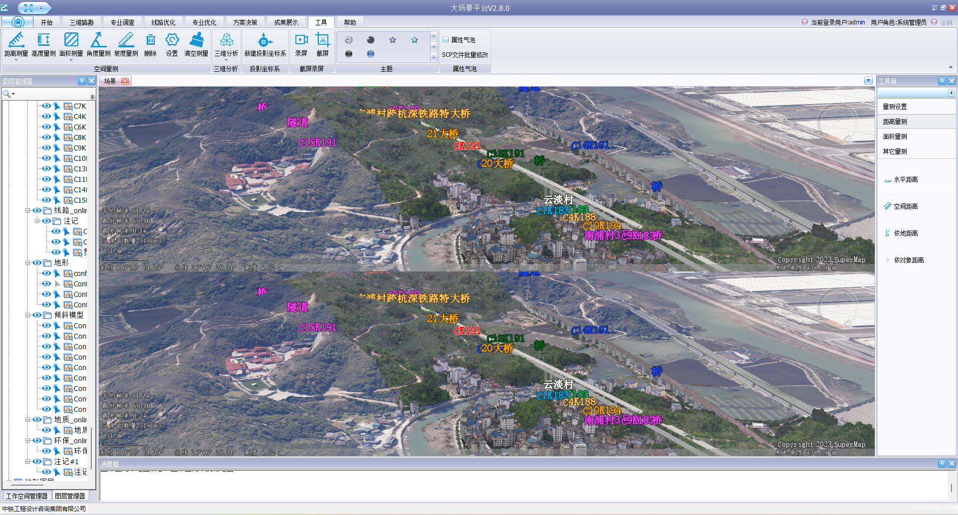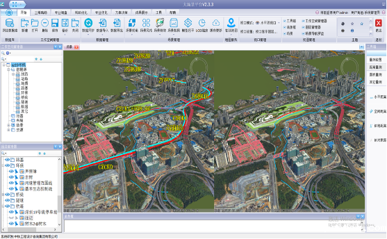 通过三维地理空间数据、线路方案数据、专业设计数据以及BIM模型的加载与融合,系统可为勘察设计人员在计算机屏幕上构建一个真实直观、信息丰富、可量测、多视角的铁路三维设计场景。