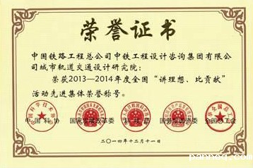 日前,在中国科学技术协会、中华人民共和国发展和改革委员会、中华人民共和国科学技术部、国务院国有资产监督管理委员会和中华全国总工会共同组织的“讲理想、比贡献”活动评比中,中国铁路工程总公司betway比赛篮球城市轨道交通设计研究院荣获2013-2014年度全国“讲理想、比贡献”活动先进集体,并获得了荣誉证书和奖牌。