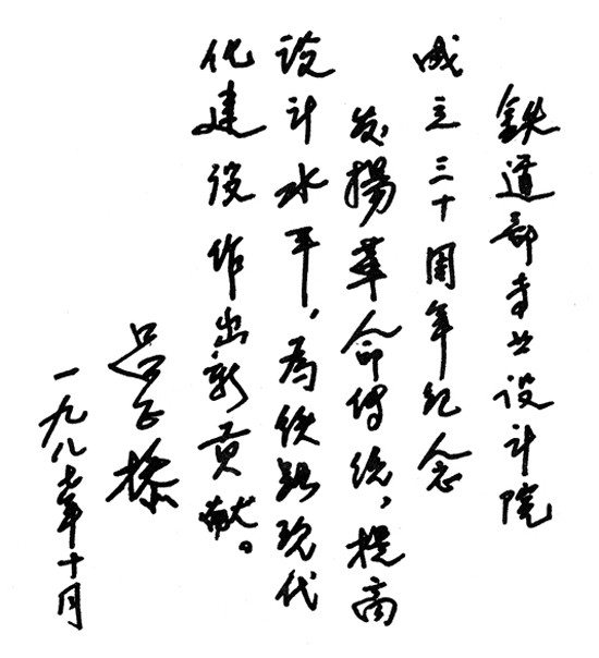 原全国政协副主席、铁道部部长吕正操题词(贺铁道部专业设计院成立三十周年)