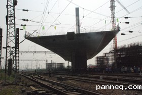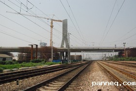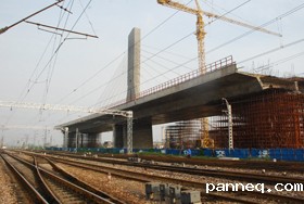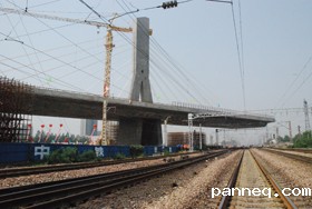 河北省第一座公路转体斜拉桥,其转体重量及转体角度均居世界同类桥梁领先水平。该桥主桥为45+85+85+45米四跨连续独塔单索面预应力混凝土部分斜拉桥,桥面全宽33m,桥面整幅布置。主桥结构采用墩、塔、梁固结体系,设8对斜拉索。该桥转体长度为71+71m,转体角度为75.74,转体重量为16200t。