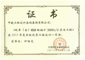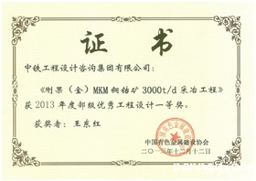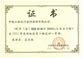 项目位于刚果民主共和国加丹加省克洛维兹市,设计采矿规模3000t/d,年产阴极铜25000t/a,包括采矿、浸出、萃取、电积等部分。中铁咨询冶金院主要负责萃取-电积生产线的施工图设计任务,设计采用了三萃一反萃取、不溶阳极电解生产阴极铜的冶炼工艺。2010年完成初步设计工作,2011年完成施工图设计工作, 2012安排专业技术人员进行该项目的现场技术服务工作。2012年10月项目提前半年实现一次试生产成功,产出第一批高纯阴极铜,并顺利达到了设计产能。该项目荣获2013年度全国有色金属行业部级优秀工程设计一等奖。