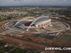 体育场总占地面积33公顷,建筑面积36475m2,西看台钢结构罩棚拱顶高度63.8m,东看台钢结构罩棚拱顶高度48.1m。钢结构罩棚分东、西两片,分别由钢结构大拱架、外圈环行钢结构桁架、V形支撑柱和螺栓球节点网架组成。拱架拱脚与V形柱柱脚落地,与看台主体完全脱离。体育场最突出的是328m跨度的看台罩棚钢拱,其跨度及施工难度是目前非洲地区体育场之最。