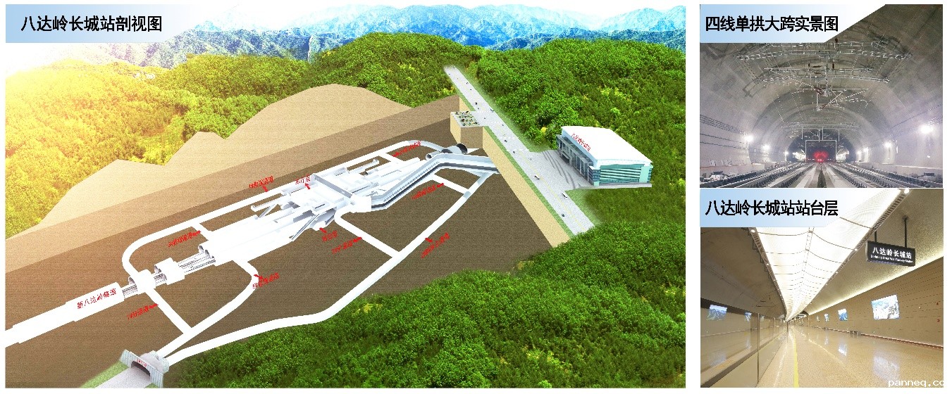 八达岭长城隧道地处八达岭核心风景区,全长12公里。八达岭长城站设在新八达岭隧道内,车站为三层三纵结构的复杂洞室群地下车站,相邻洞室最小水平间距2.2米、最小垂直间距4.5米,最大埋深102米,站隧过渡段为超大跨结构,最大跨度32.7米,地下部分建筑面积4万平方米。必威betway登录研发了超大跨松散围岩隧道修建技术,解决了深埋地下站防灾救援疏散、舒适环境构建、小净距洞群稳定及超长耐久性等系列难题,实现了世界上埋深最深、规模最大的全暗挖站隧一体高铁车站。