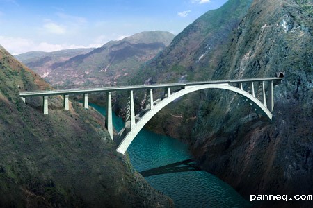 该桥为国家 “十一五”西部地区交通基础设施建设重点工程大理至瑞丽铁路控制性工程,桥址河床狭窄,呈V型,地势险峻,两岸山坡角度约60度,局部岩面达90度。地质条件复杂,施工难度极大。澜沧江特大桥桥跨布置为:(1-32+2-24+1-32)m简支箱梁+363m上承式拱桥+1-32m简支箱梁,全桥长528.1m。主跨为内包钢管混凝土劲性钢骨架的钢筋混凝土拱桥,是我国最大跨度的钢筋混凝土铁路拱桥之一。该桥利用两岸陡峭的岩体支撑进行拱肋钢结构的立式拼装,通过二次竖转的新技术完成钢管桁架劲性骨架的安装,向下竖转重量2500t,减小了高空作业工作量,主弦管对位、焊接条件好。
